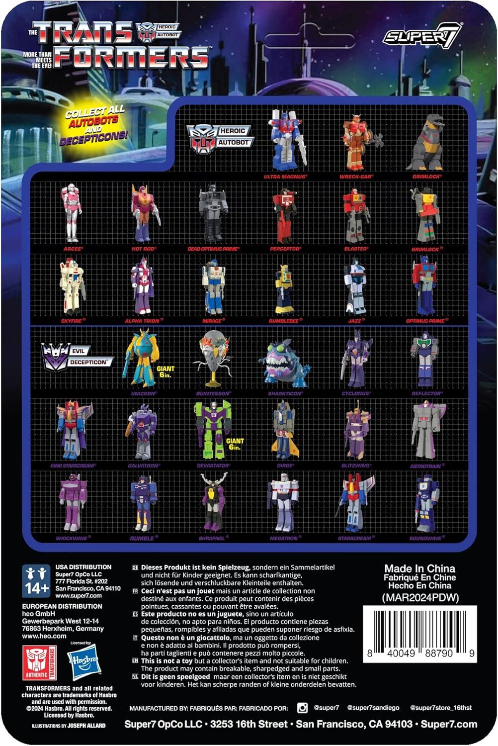 “Robots in disguise!” The Super7 x Transformers collaboration expands as the Autobots and Decepticons join the 3.75-inch ReAction Figure world! Starscream, the treacherous Decepticon Air Commander, comes with blaster accessory. Packaged on a card back featuring brand new retro-style art. Super7 makes retro collectibles, vintage toys, and nostalgia gifts for pop culture fanatics and collectors. We grew up with giant monsters, comic books, punk, science fiction, skateboarding, robots, and rebellion. No one made what we wanted. So we made it ourselves.
