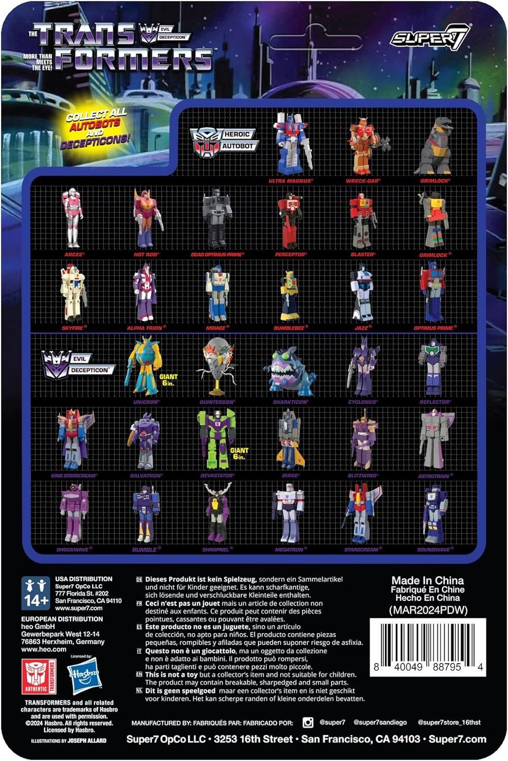 “Robots in disguise!” The Super7 x Transformers collaboration expands as the Autobots and Decepticons join the 3.75-inch ReAction Figure world! Starscream, the treacherous Decepticon Air Commander, comes with blaster accessory. Packaged on a card back featuring brand new retro-style art. Super7 makes retro collectibles, vintage toys, and nostalgia gifts for pop culture fanatics and collectors. We grew up with giant monsters, comic books, punk, science fiction, skateboarding, robots, and rebellion. No one made what we wanted. So we made it ourselves.