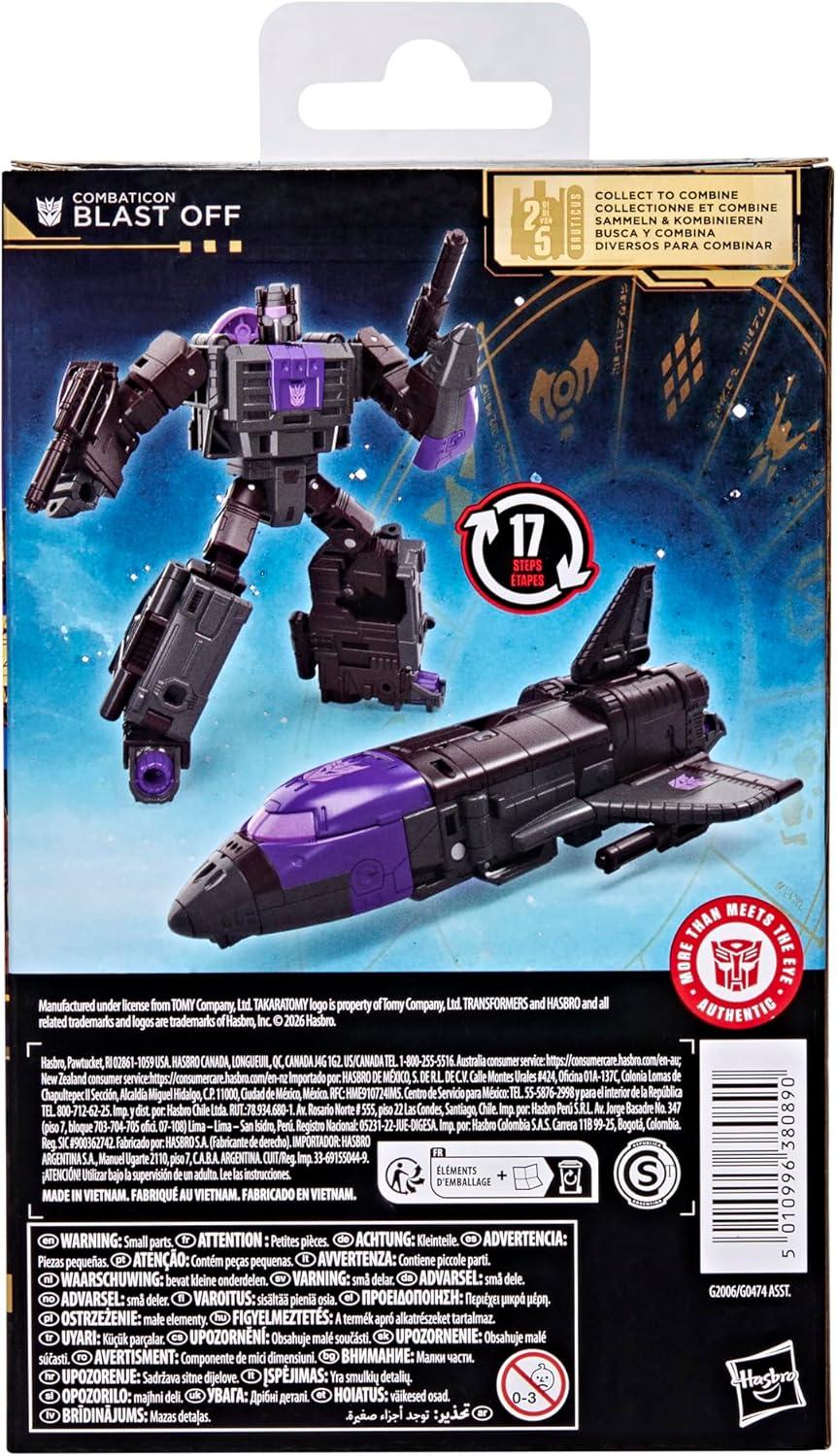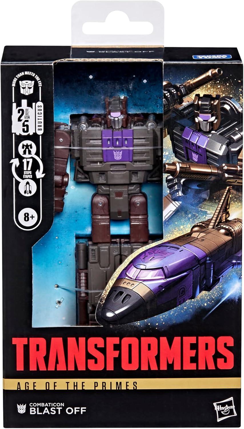 Experience the epic universe of Transformers robots with the Transformers Age of the Primes Combaticon Blast Off toy! The 5.5-inch (14 cm) Deluxe Class figure converts from robot action figure to space shuttle mode in 17 steps and can be combined with additional Combaticon figures (each sold separately, subject to availability) to make a Bruticus figure. With intricate poseability and attachable accessories, the Combaticon Blast Off action figure makes an awesome addition to any collection. Look for more Transformers collectible toys (sold separately, subject to availability) featuring characters like Optimus Prime, Bumblebee, Megatron, and more to create a lineup that is — More Than Meets the Eye. TRANSFORMERS and HASBRO and all related trademarks and logos are trademarks of Hasbro, Inc.