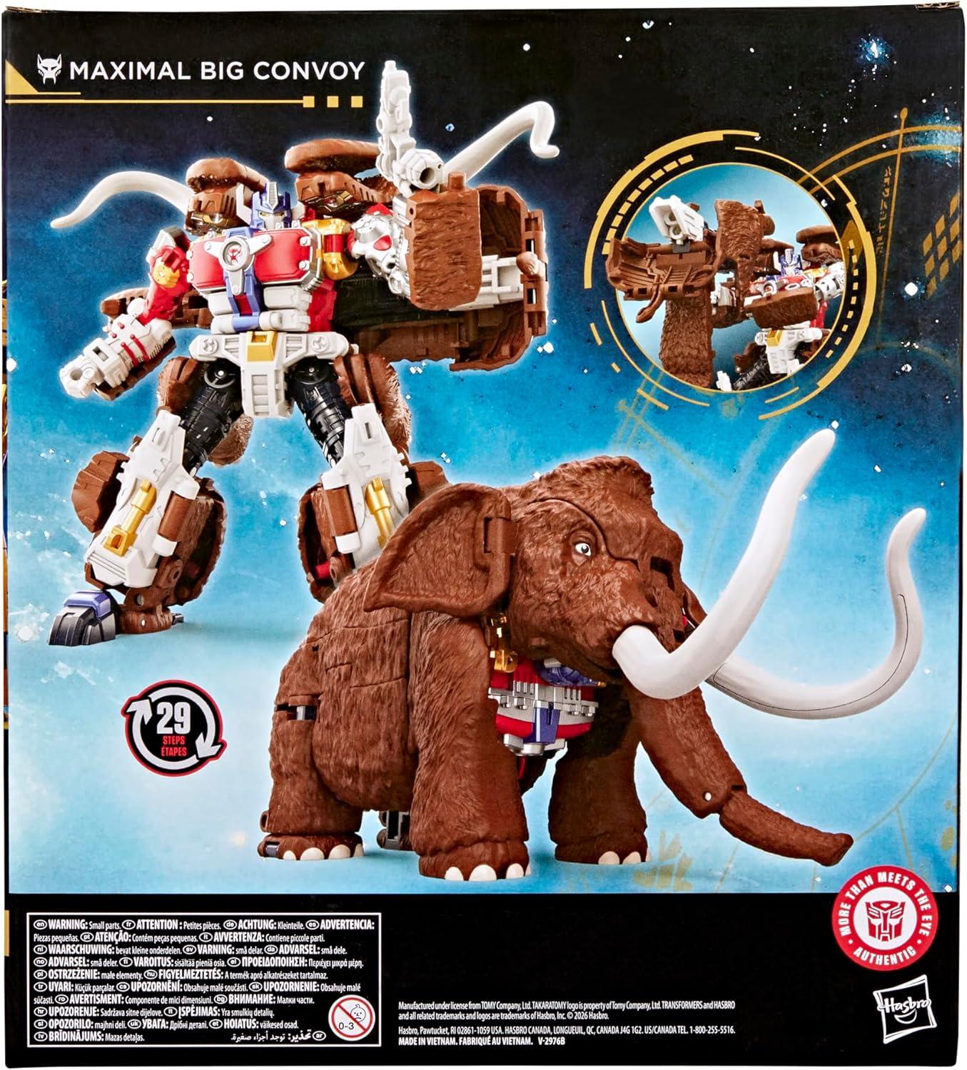 Experience the epic universe of Transformers robots with the Transformers Maximal Big Convoy toy! The 6.5-inch (16.5 cm) Leader Class figure converts from robot action figure to mammoth mode in 29 steps. With intricate poseability and attachable accessories like his iconic big cannon, a blaster, missiles, and removable tusks, this Maximal Big Convoy action figure makes an awesome addition to any collection. Look for more Age of the Primes Transformers collectible toys (sold separately, subject to availability) featuring characters like Razorclaw, The Thirteen Alpha Trion, and Junkion Jalopy and more to create a lineup that is — More Than Meets the Eye. TRANSFORMERS and HASBRO and all related trademarks and logos are trademarks of Hasbro, Inc.