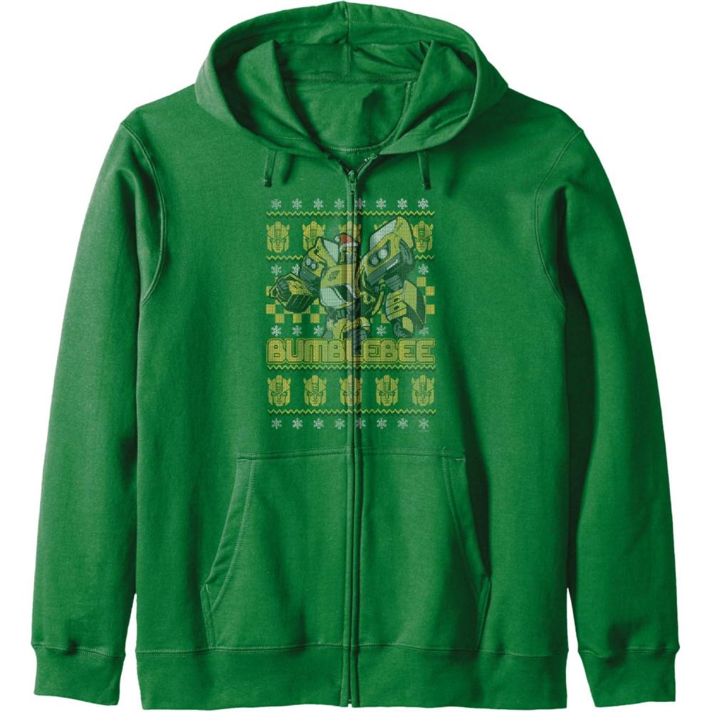 Transformers Christmas Bumblebee Ugly Sweater Zip Hoodie(Dark Green)