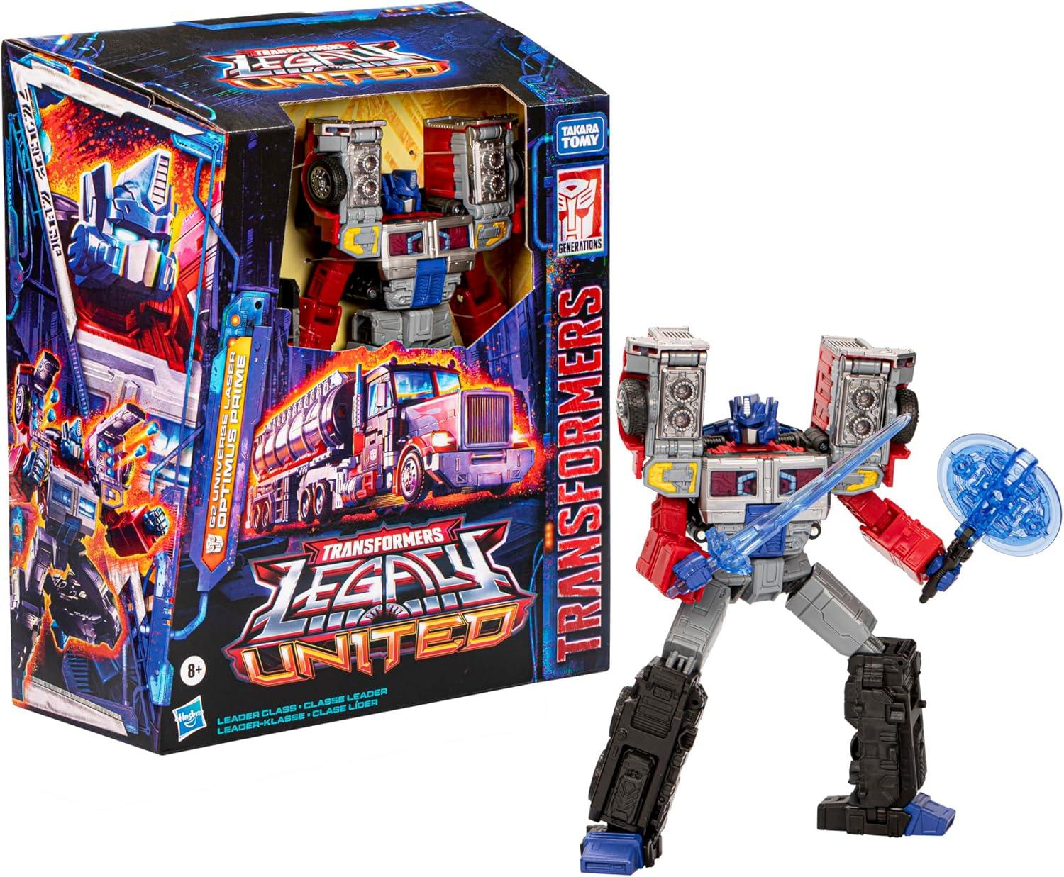 Unite your favorite characters from across the world of Transformers robots into your collection with the Transformers Legacy United Leader Class G2 Universe Laser Optimus Prime action figure! This 7.5-inch G2 Universe Laser Optimus Prime action figure converts between robot and truck modes in 29 steps. Gear up for battle with the included Energon axe, sword, blaster, and Matrix of Leadership accessories that attach in both modes. The G2 Universe Laser Optimus Prime figure is inspired by the character from the animated series, Transformers: Generation 2, and features articulated head, arms, and legs for awesome action poses. Celebrate the last 40 years of Transformers history with Transformers Legacy action figures. Transformers Legacy opens the portal to a whole new universe of — More Than Meets the Eye — bringing together every Transformers generation like you’ve never seen before. Collect and combine different characters to create your ideal Legacy lineup. TRANSFORMERS and HASBRO and all related trademarks and logos are trademarks of Hasbro, Inc. © 2024 Hasbro.
