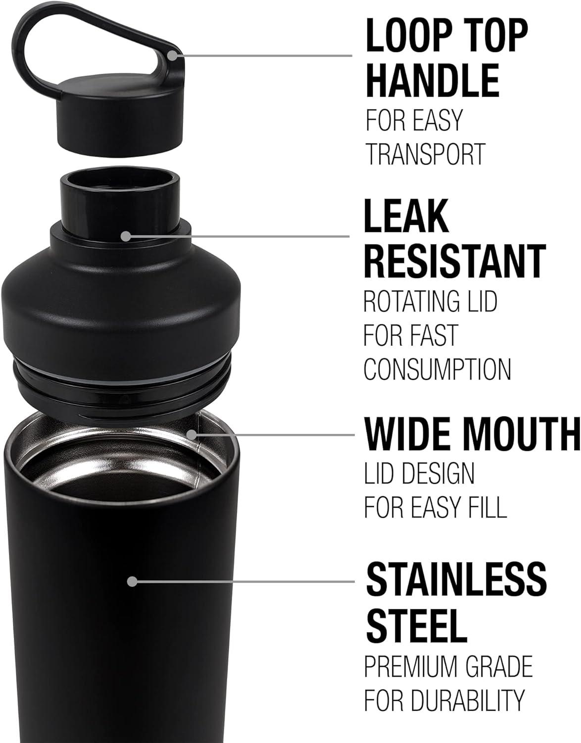 SWEATPROOF CONSTRUCTION: Fabricated from pro grade 18/8 powder-coated stainless steel, our sweat-proof canteen keeps condensation away. Refillable and reusable, our bottle features a 2-in-1 screw-top design. The wide mouth opening ensures easy filling, while the compact loop-top cap makes drinking a breeze.