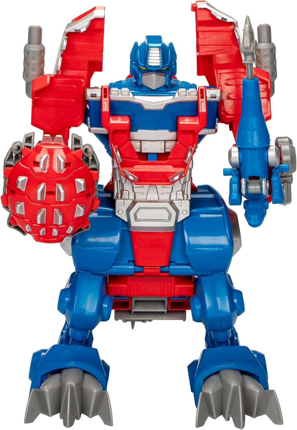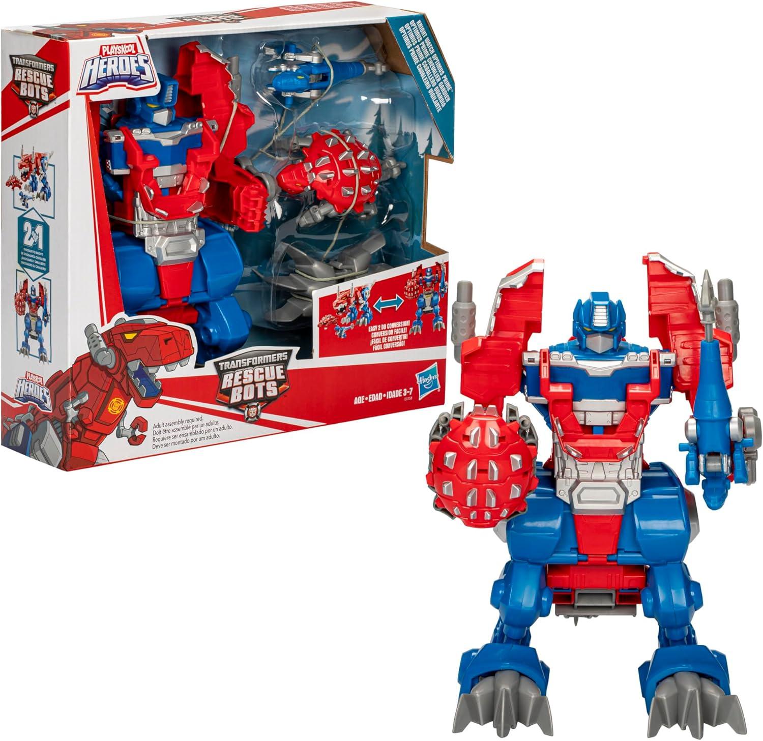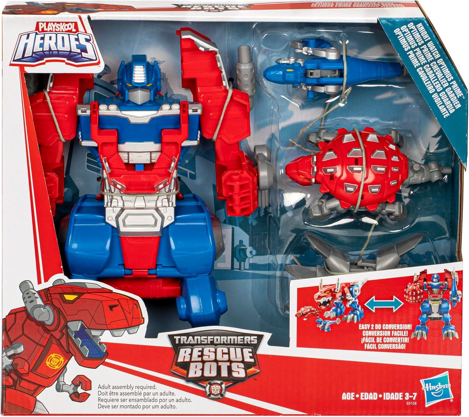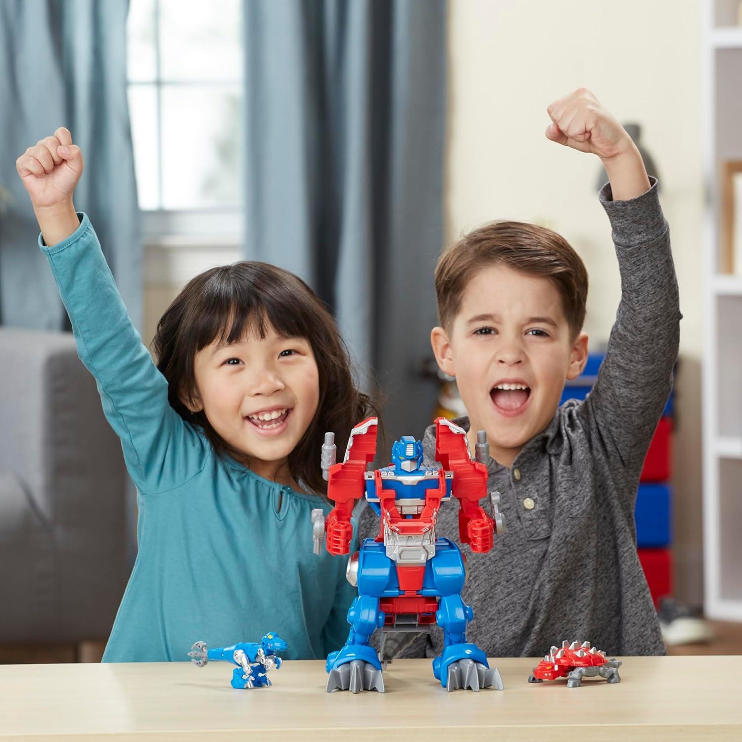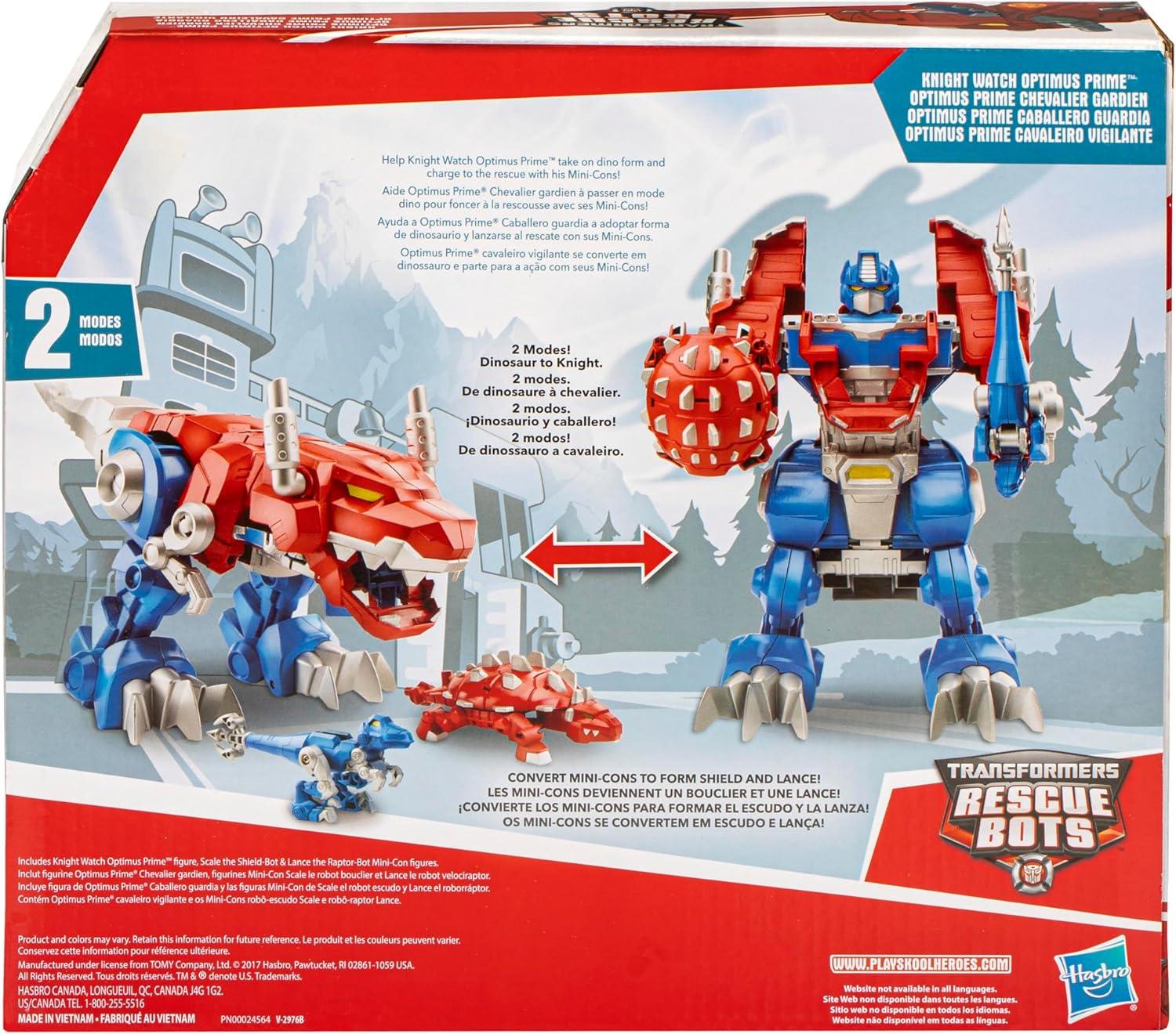 Imagine helping Knight Watch Optimus Prime save the day in medieval times alongside his Mini-Cons, Scale the Shield-Bot and Lance the Raptor-Bot! Kids can pretend to march into battle with Optimus Prime as a heroic knight, wielding the Mini-Con figures as a shield and lance. Knight Watch Optimus Prime and his Mini-Cons are designed with Easy 2 Do conversion, so kids can imagine an emergency is unfolding elsewhere and convert Optimus Prime from a knight to a T-Rex with 1 step! Then, also with 1 step each, convert the Mini-Con figures into a stegosaurus and a velociraptor, and imagine racing to the rescue! Also look for other Playskool Heroes Transformers Rescue Bots figures to build a rescue team. (Other figures each sold separately. Subject to availability.)