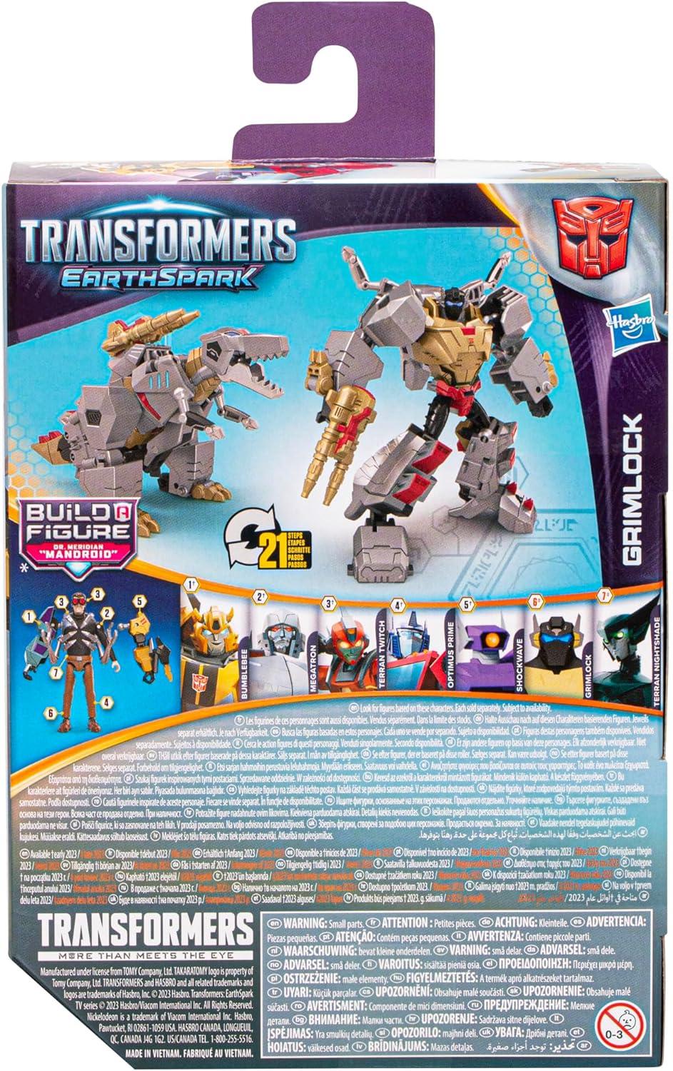 Transformers: EarthSpark introduces a new generation of Transformers robots – the first Transformers bots to be born on Earth. Together with the human family who welcomes them in and cares for them, they'll redefine what it means to be a family. Deluxe Class figures bring Transformers robots to life from the television screen right to your home! Classic gold and gray Grimlock toy as seen in Transformers: EarthSpark animated TV series stands at an impressive 5 inches tall! Convert Transformers Grimlock from robot to dino mode in 21 steps. Each Deluxe Class figure comes with 1 build-a-figure piece. Combine all the pieces by collecting all Deluxe Class figures to build a figure of Dr. Meridian “Mandroid”, the villainous half-human half-robot from the animated series. Build-a-figure scale is 4.5 inches (figure does not convert). (Each sold separately, subject to availability). Transformers and all related characters are trademarks of Hasbro.