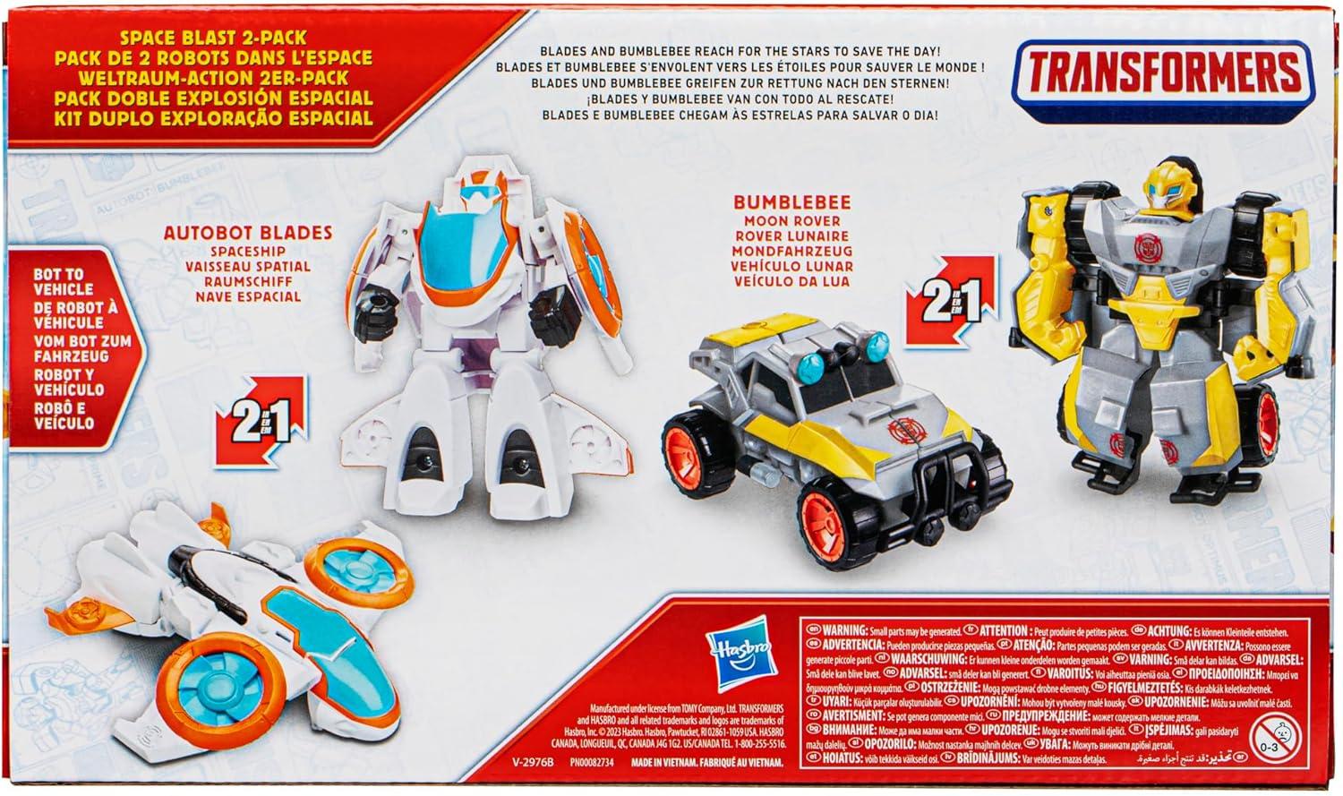 3, 2, 1…blast off! Prepare for an out-of-this-world adventure with the Transformers Space Blast 2-Pack, featuring Transformers action figures that convert to space-themed vehicle alt modes! This multipack comes with 2 Transformers robot toys: Bumblebee and Autobot Blades—sized just right for small hands at 4.5 inches tall. Kids ages 3 and up can enjoy twice the fun with 2 modes of play, converting the Transformers Bumblebee figure from robot to moon rover mode and Autobot Blades figure from robot to spaceship mode and back again in 1 easy step. Look for other Transformers toys and imagine saving the day on heroic space missions (each sold separately, subject to availability). Transformers is a trademark and copyright of Hasbro.