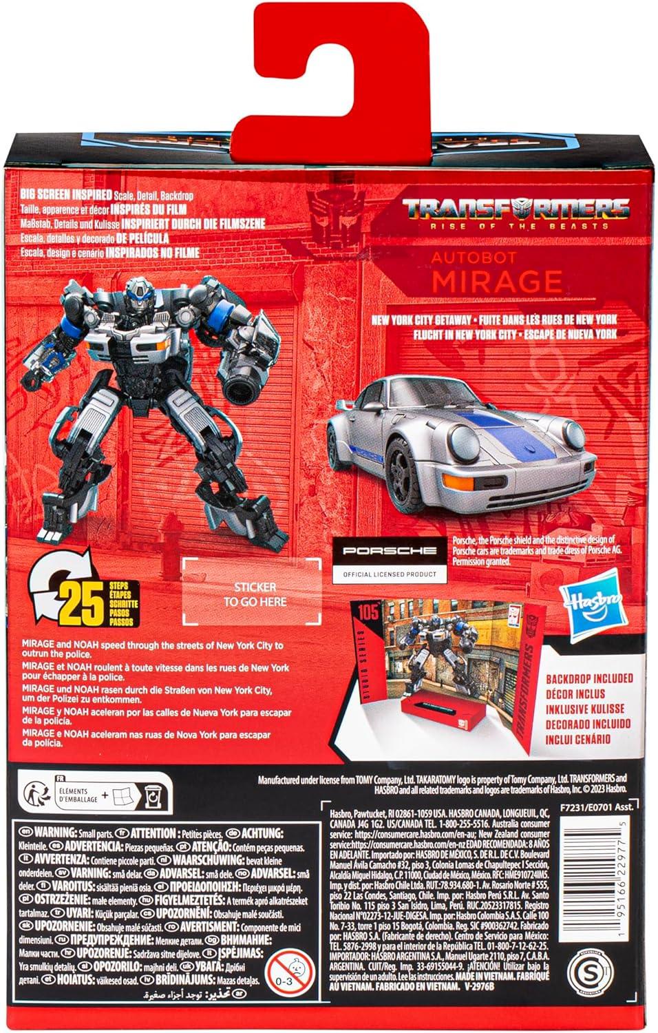 Bring the epic action of the Transformers movies from the big screen into your collection with the Transformers Studio Series Deluxe Class 105 Autobot Mirage action figure, inspired by Transformers: Rise of the Beasts! Mirage and Noah speed through the streets of New York City to outrun the police. Transformers Studio Series toys are collectible action figures for 8 year old boys and girls that feature movie-inspired details and accessories. Convert the action figure from robot to Porsche 911 Carrera mode in 25 steps and pose the Autobot Mirage toy in the included New York City Getaway removable backdrop scene. Transformers action figures for boys and girls make great gifts! Transformers and all related characters are trademarks of Hasbro. Hasbro and all related terms are trademarks of Hasbro. Porsche, the Porsche shield and the distinctive design of Porsche cars are trademarks and trade dress of Porsche AG. Permission granted.